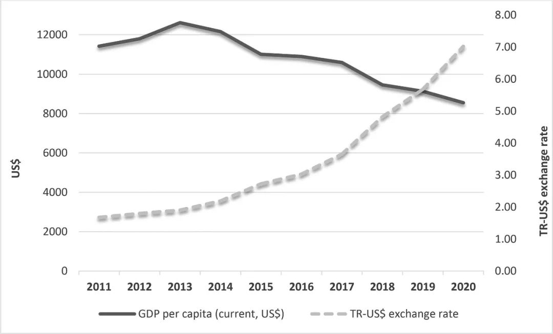 (辛勤来源:Electronic Data Delivery System (EVDS), Central Bank of the Republicof Turkey. GDP per capita figures from World Bank database)